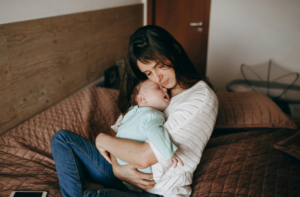 Une jeune mère paraît fatiguée.